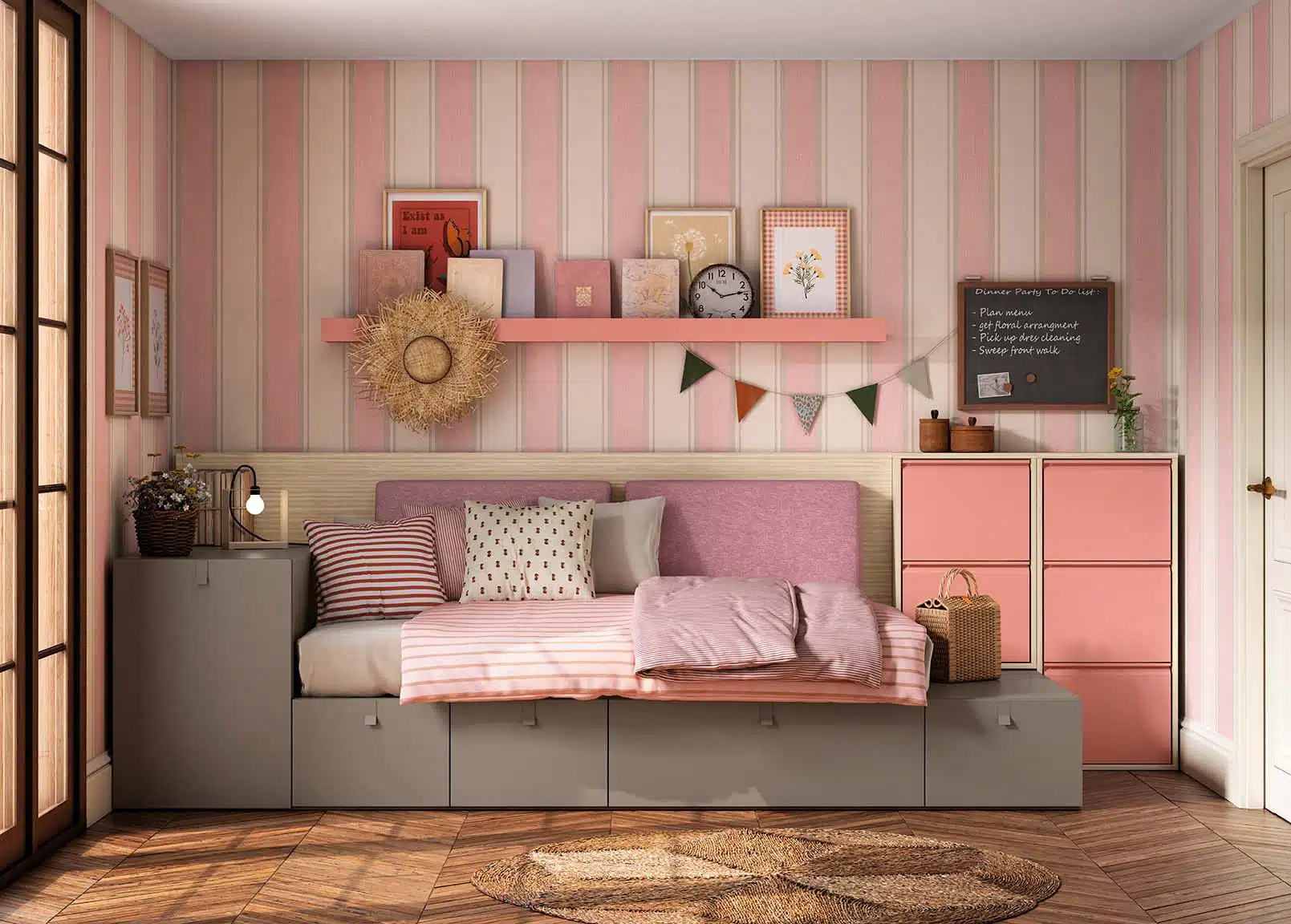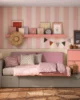 La decoración estilo cottagecore completa la habitación con un ambiente cálido, natural y relajante. Inspirada en la naturaleza, las flores y el aire libre, incluye papel de pared a rayas, cuadros juveniles, ropa de cama y cojines que aportan color, textura y estilo. Este enfoque decorativo crea un dormitorio acogedor, estético y funcional, ideal para estudiar, descansar y disfrutar de un espacio creativo y personalizado.