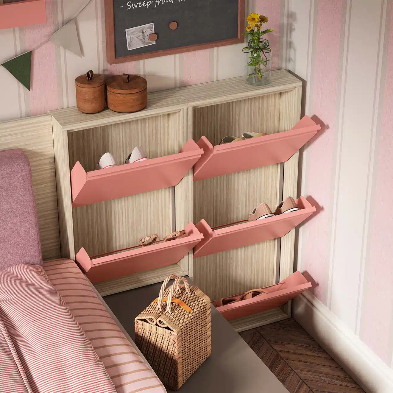 El conjunto incluye un zapatero colgado con frontales metálicos personalizables, que se adapta fácilmente a cualquier zona de la habitación y combina con el acabado de la estructura de melamina. Esta solución permite optimizar el espacio, manteniendo la habitación ordenada y con un diseño armonioso y moderno. La cama modular también permite elegir colores, acabados y complementos.