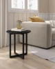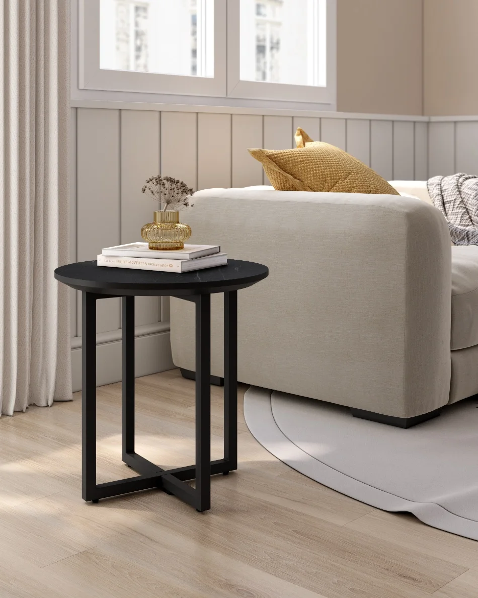 La estructura metálica en color negro refuerza su carácter actual y le proporciona una excelente estabilidad. Además, incorpora patas regulables que permiten adaptarla a diferentes superficies, garantizando comodidad y firmeza en su uso diario. Con unas dimensiones de 40 cm de diámetro y 48 cm de altura, esta mesa auxiliar resulta ideal como mesa de apoyo junto al sofá, mesita decorativa o incluso como complemento en dormitorios.
