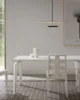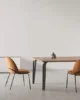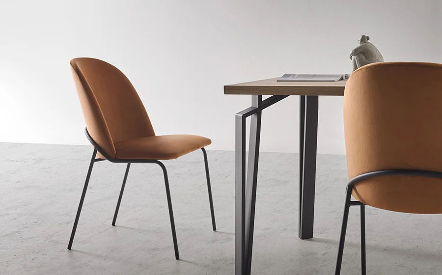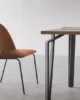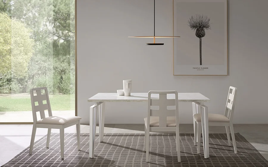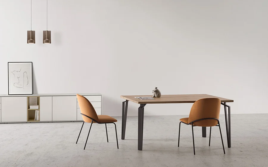 La tapa de la mesa, con un grosor de 3 cm, está disponible en diferentes acabados para adaptarse a distintos estilos decorativos. Puede fabricarse en melamina de primera calidad, ideal para quienes buscan practicidad y resistencia, o en chapa de madera natural de haya o roble, opciones que aportan mayor calidez y elegancia al conjunto. Además, la estructura metálica puede lacarse en múltiples tonalidades, lo que permite una personalización total para integrarse en ambientes modernos, nórdicos o industriales.