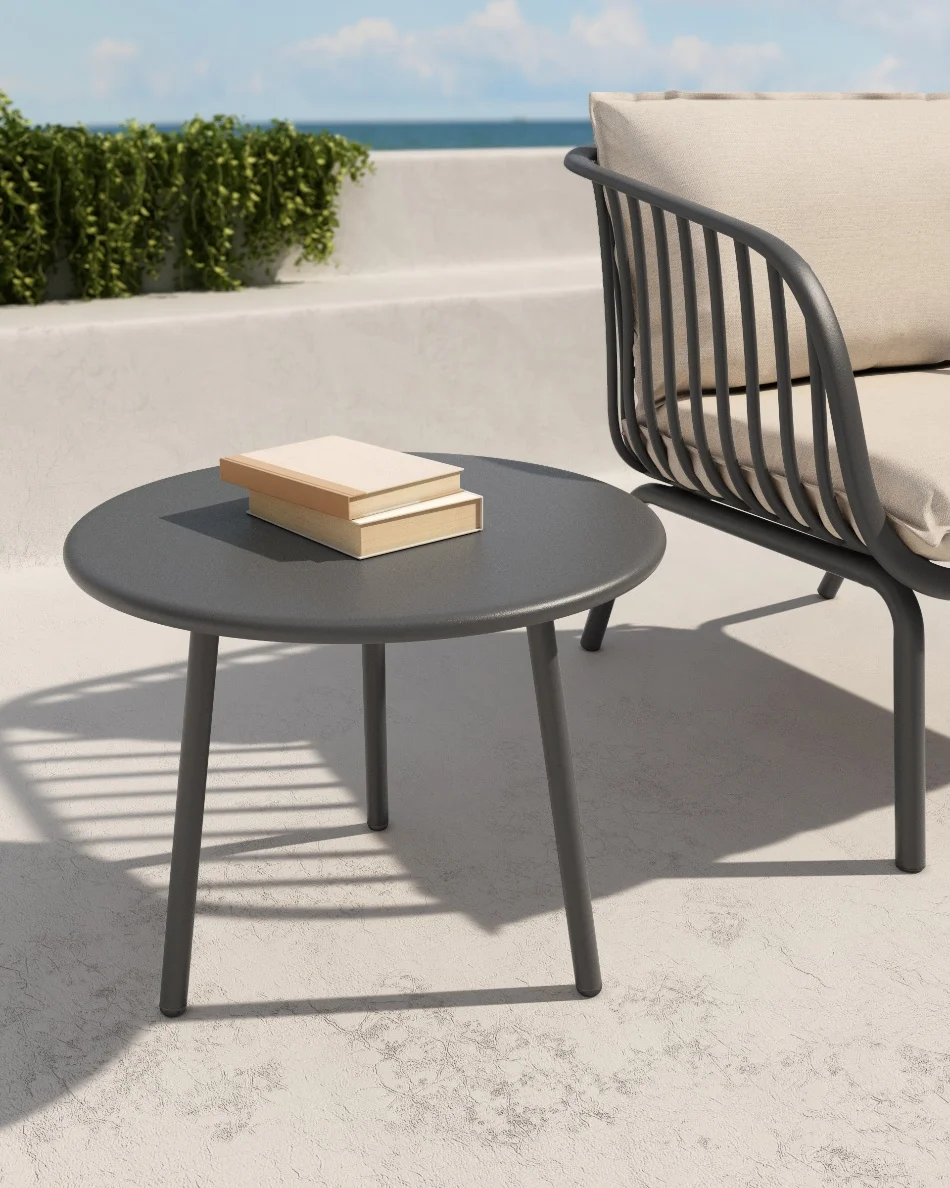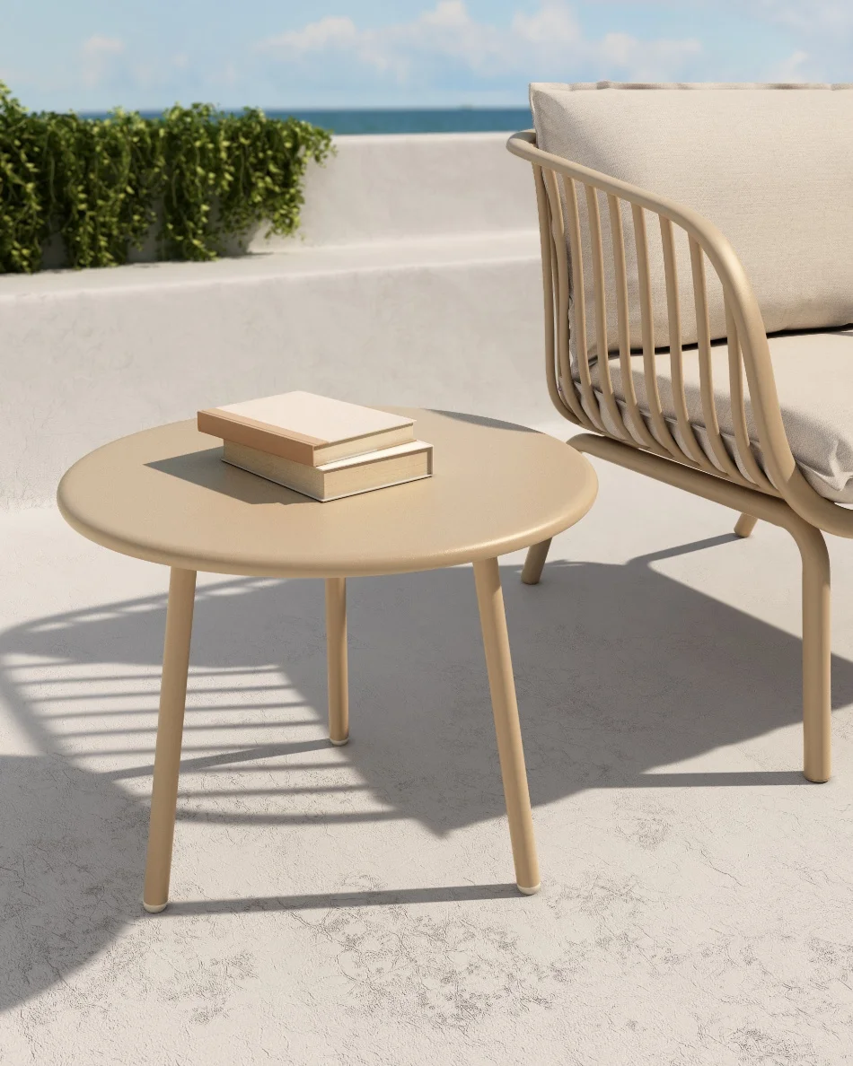 La mesa auxiliar exterior Samoa arena Ø 50 cm es una pieza de diseño moderno, funcional y versátil, pensada para adaptarse tanto a espacios exteriores como interiores. Su estética ligera y contemporánea la convierte en una opción ideal para terrazas, balcones, jardines o rincones de descanso en el hogar, aportando un toque decorativo discreto pero elegante.