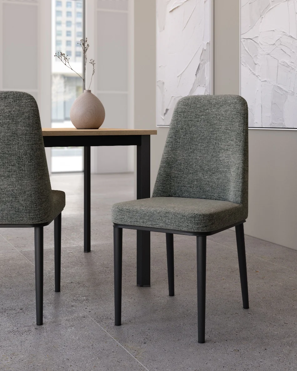 Las patas metálicas en acabado negro refuerzan su carácter moderno y aportan una base sólida y resistente, garantizando estabilidad en el uso diario. Además, su estructura ligera facilita su movilidad y colocación en diferentes estancias como comedor, cocina, despacho o sala de reuniones.