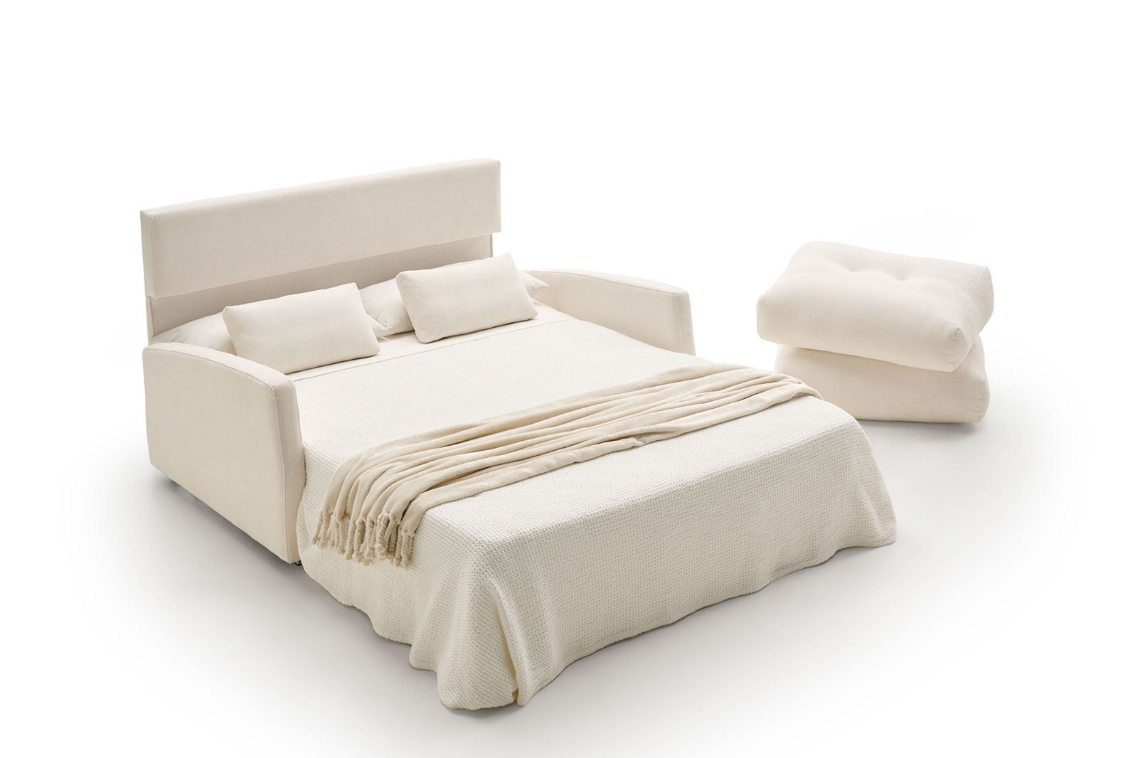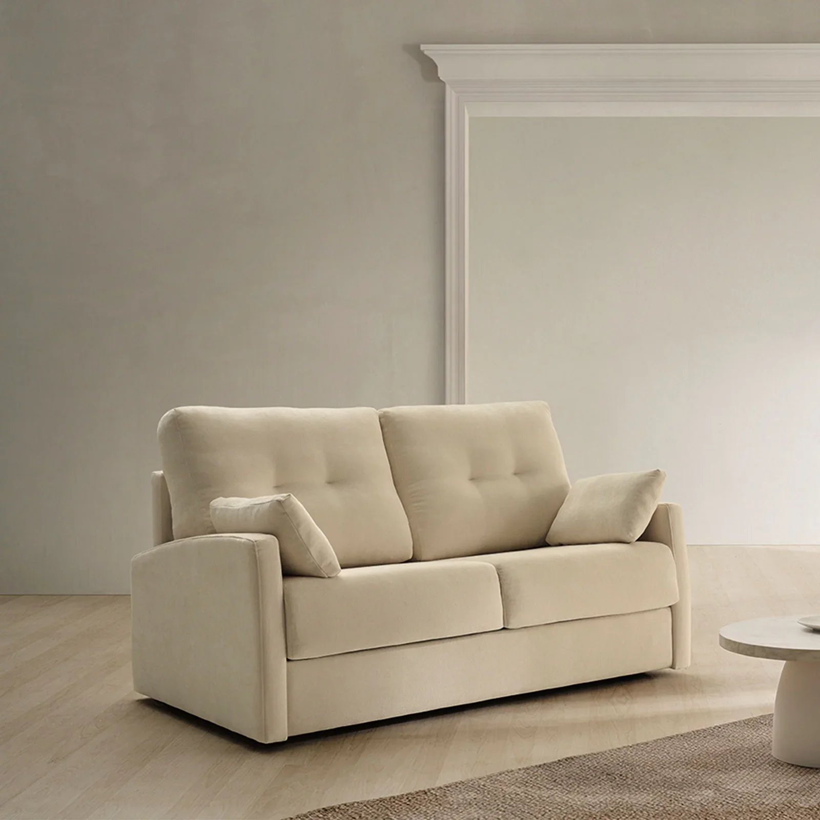 Sofá cama funcional y resistente, fabricado con sistema Semi–italiano de apertura práctica y estructura robusta en madera reforzada. Incorpora acolchados de alta calidad que proporcionan comodidad y adaptabilidad.